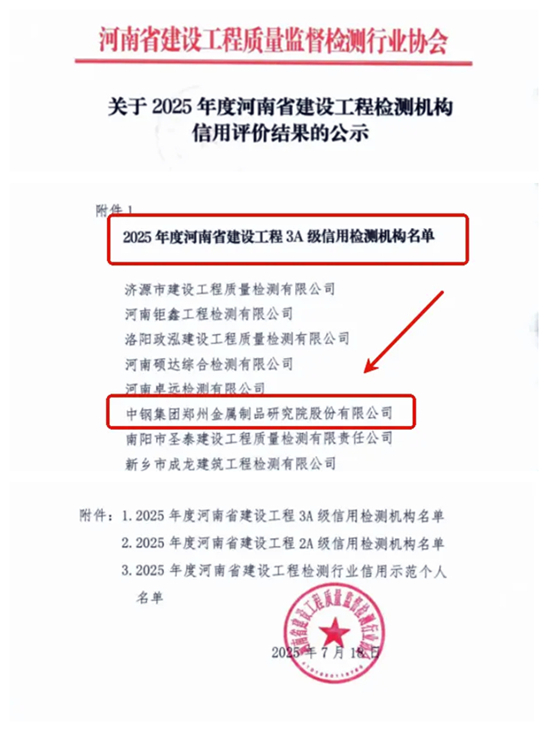 中鋼制品院榮獲2025年度河南省建設(shè)工程3A級(jí)信用檢測(cè)機(jī)構(gòu)證書(shū)